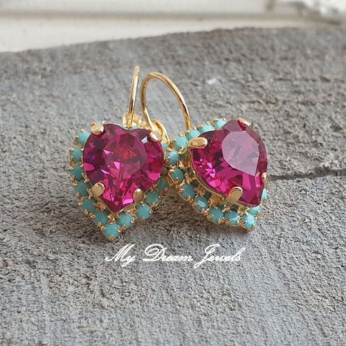Luxe Oorbellen met Swarovski Hart Fuchsia & Turquoise